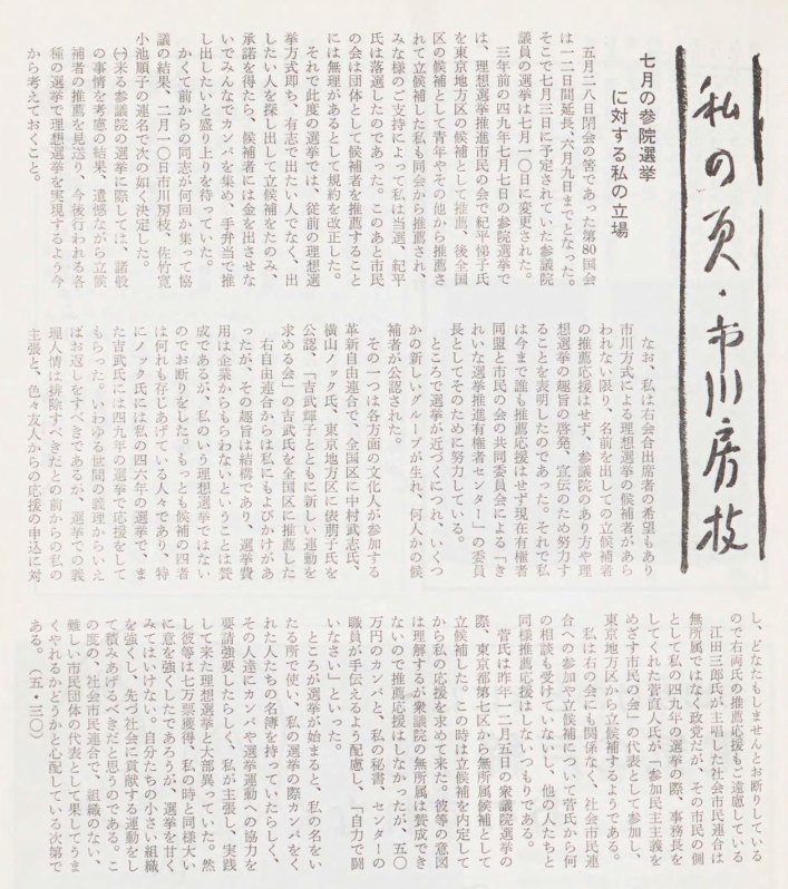 私の国会報告にあり婦人展望に無い部分としては、菅が社市連に参加したことや選挙後に市民の会を追放されたことへの感想がある。